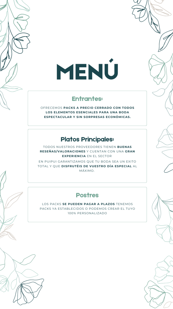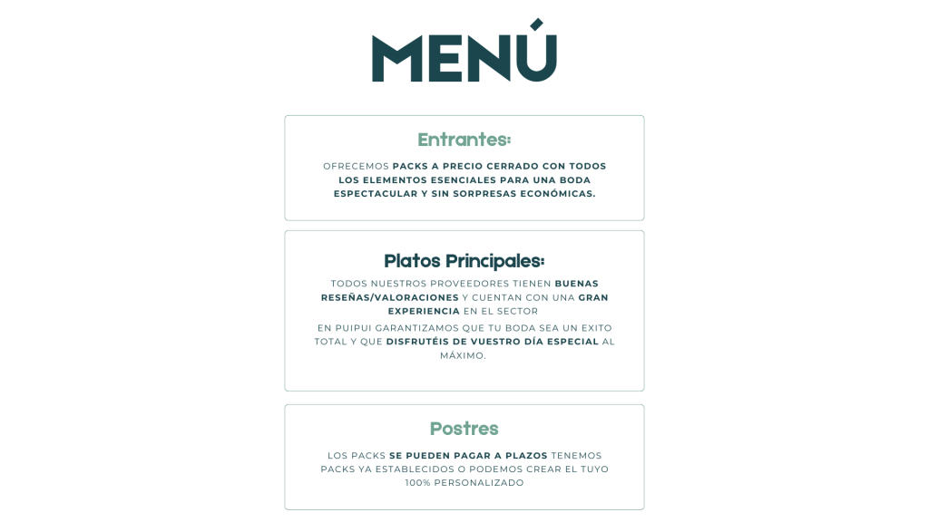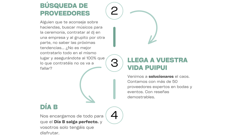 En PUIPUI somos expertos en crear bodas, llevamos más de 4 años en el sector nupcial y estamos al tanto de las ultimas tendencias y novedades. No somos weddings, somos organizadores de eventos, trabajamos con proveedores y weddings propios (como colaboradores) y, en el caso de ya tener contratado algún proveedor no importa, también trabajamos con ellos sin cobrar ningún tipo de extra o tener penalización. No cobramos comisiones por gestión. Nuestros precios son competitivos porque hablamos directamente de proveedor a proveedor.