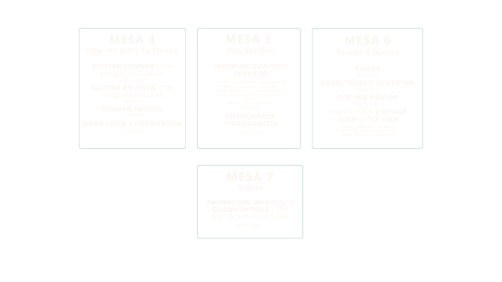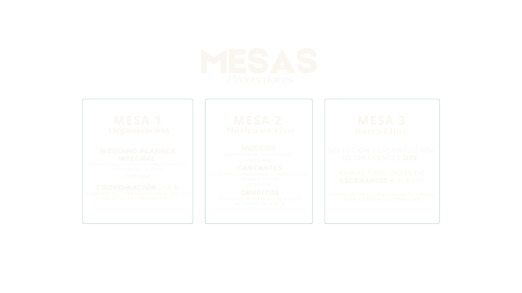 A continuación te mostramos «Nuestras Mesas», estas mesas no son nuestros packs (lo encontrarás más abajo)  son los proveedores con los que solemos trabajar y sus precios aquí señalados son orientativos,  para que puedas hacerte una idea desde donde partimos, los precios de los packs suelen ser más económicos.